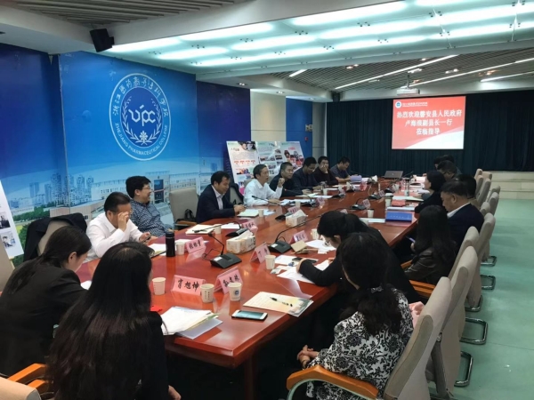 11月7日,磐安县副县长卢海浪率政府办公室副主任李兵、教育局副局长陈卓珺、科技局副局长周中良、农业局副局长马顺水、经商局局长陈金龙、市场监管局局长张标量、新城区管委会副主任陈鸿伟等一行八人来beat365交流洽谈校地合作。校长任文霞、校党委副书记杨俊杰、副校长金辉、纪委书记方子祥热情接待了卢海浪一行,科研处(科技产业与社会服务处)、教务处以及商学院、中药学院、食品学院、继续教育学院负责人参加交流座谈会。