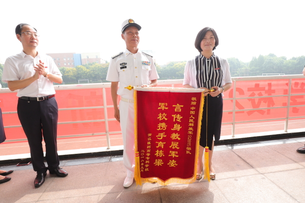 校长任文霞代表学校向中国人民解放军92815部队赠送了锦旗,向承训教官和部队各机关部门的支持与配合表示诚挚的感谢,并对2018级新生军事训练取得的优异成绩表示热烈的祝贺。