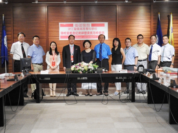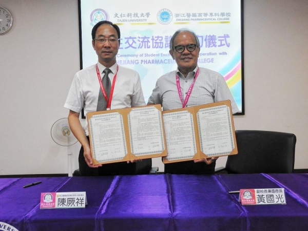 陈厥祥书记一行受到三所台湾高校的热烈欢迎。双方相互介绍了学校的发展历史、办学特色及发展规划,并就学分互认、师生交流、专业合作、学科建设等方面进行了深入交流。陈书记代表学校与弘光科技大学签署了《浙江医药高等专科学校与弘光科技大学学术交流协定书》与《浙江医药高等专科学校与弘光科技大学学生交流协定书》,与大仁科技大学签署了《浙江医药高等专科学校与大仁科技大学学生交流协定书》,并热情邀请三所台湾高校参加拟于今年九月份举办“2018甬台教育合作交流会”。