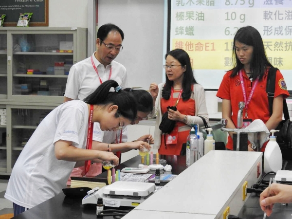 学习交流团一行还实地走访了参访高校药学、化妆品、食品、生物医学工程实验实训基地及教学楼、图书馆、食堂等教学生活场所,并参与体验教学设备,与台湾专业教师进行了实地交流。大仁科技大学副执行长洪堂耀教授还带领同学们亲手制作了乳木果润唇膏。