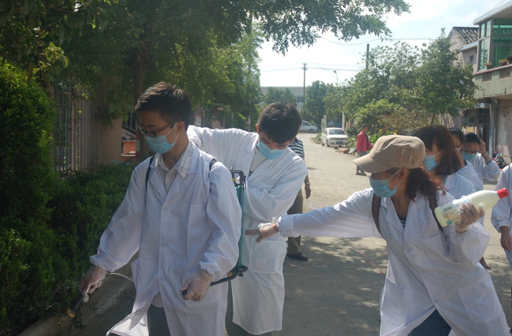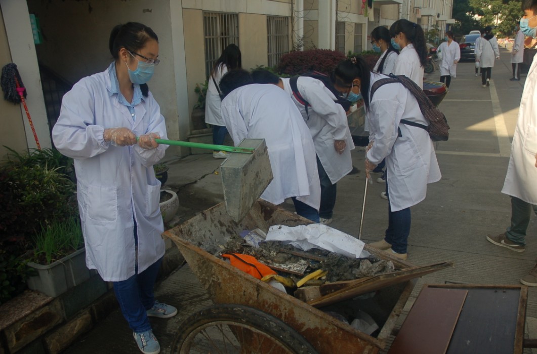 10月13日,beat365药学系紧急组织36名大学生志愿者来到结对服务社区——鄞州区潘火街道泗港社区,积极开展灾后清理、防疫消毒和健康知识宣传工作。一到社区,志愿者们就三两分工对社区里的沟渠、垃圾堆放处、过道、楼梯等重点部位喷洒消毒液,之后对社区内的178家住户挨家挨户进行入户消毒。经过洪水数日围困和浸泡,很多居民情绪比较焦虑、缺乏安全感,经常要求志愿者对自己房内的所有地方喷洒消毒液,而且要求一遍不够要多喷几遍。遇到这种情况志愿者们在做好房内死角等主要部位的消毒后都会耐心劝导居民消毒适度即可,过之反而会对健康产生影响,让其放心消毒后的房内安全,同时送上饮食卫生、安全用药和健康生活方式小贴士。