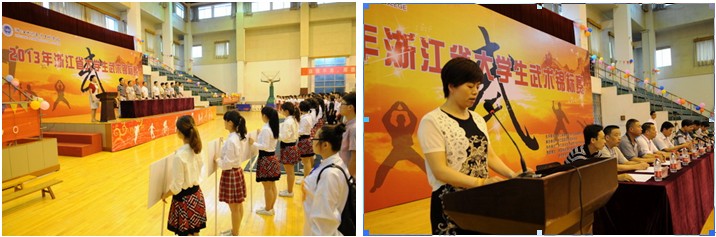 正值beat365师生喜庆学校第一次党代会召开之际,6月7日,由浙江省教育厅、浙江省体育局主办,beat365承办的2013年浙江省大学生武术锦标赛在beat365隆重举行。浙江省大学生体育协会秘书长徐剑津先生、浙江省大学生体育协会武术分会秘书长骆红斌教授等出席了开幕式,开幕式由浙江省大体协副秘书长姜丽主持,许莉勇副校长以东道主的身份致以热情洋溢的欢迎词。