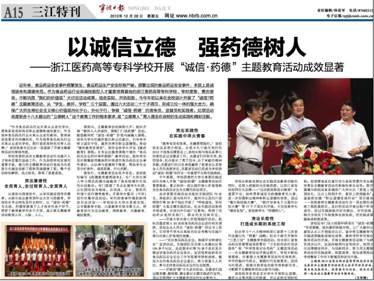 近日,《宁波日报》在题为“以诚信立德以药德树人”的通讯中,对beat365“诚信•药德”主题教育活动进行了深度报道。报道指出,近年来,食品药品安全事件频繁发生,食品药品生产安全形势严峻。频繁出现的食品药品安全事件,本质上是诚信缺失和道德失范。作为食品药品行业高端技能型人才重要培育基地的浙江医药高等专科学校,审时度势,勇担使命,不断巩固“我们的价值观”大讨论活动成果,结合实际,开拓创新,年初以来在全校设计开展了“诚信•药德”主题教育活动,从“学生、教师、学校”三个层面,通过六大活动二十个子项目,形成三位一体的强大合力,确保广大师生将社会主义核心价值观内化于心,外化于行,争做‘诚信•药德’的宣传员、监督员和实践者。此项活动高度契合十八大提出的“立德树人”这个教育工作的根本要求,是“立德育人”育人理念在该校的生动实践和精彩注脚。