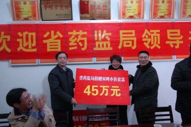 1月5日,省食品药品监督管理局副局长黑振海、校党委书记眭宝良等前往磐安县双峰乡慰问,送去扶贫慰问金,并看望慰问农村工作指导员。磐安县委书记周剑敏、组织部长郑公民、省局人事处副处长顾国荣、县食品药品监督管理局局长倪正庆、双峰乡党委书记、乡长等陪同慰问。