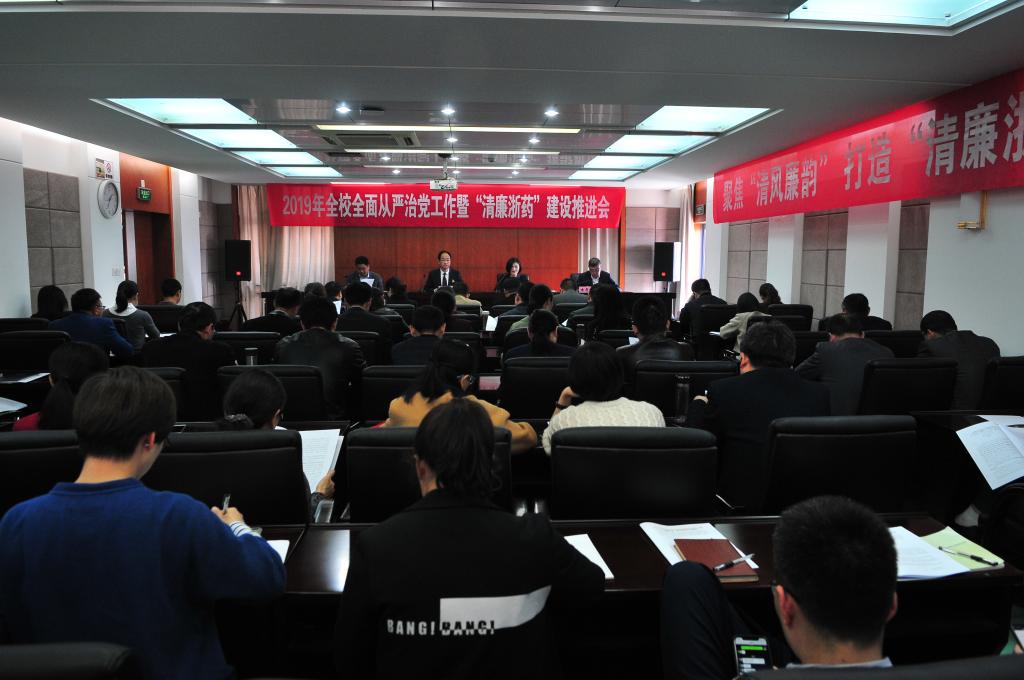 为认真贯彻落实十九届中央纪委三次全会、省纪委十四届四次全会和全省教育系统全面从严治党工作会议精神,部署落实深入推进“清廉浙江”“清廉学校”“清廉药监”建设的新要求,和学校第二次党代会关于“清廉beat365”建设的新谋划,切实履行管党治党的政治责任,不断推动beat365全面从严治党向纵深发展,4月17日下午,2019年全校全面从严治党工作暨“清廉beat365”建设推进会在926会议室召开。会议邀请了省纪委省监委驻省市场监督管理局纪检监察组陈启见副组长和陈锋两位同志来校指导。校党委书记陈厥祥,党委副书记、校长任文霞,校领导杨俊杰、许莉勇、韩忠培、方子祥、罗文华、工会主席金辉和党委委员万松钱、陆晓莉及全体中层干部、纪委委员、纪检委员、重点岗位人员参加了会议。会议由任文霞主持。