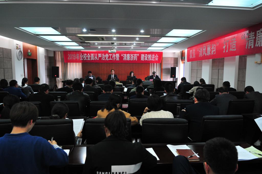 为认真贯彻落实十九届中央纪委三次全会、省纪委十四届四次全会和全省教育系统全面从严治党工作会议精神,部署落实深入推进“清廉浙江”“清廉学校”“清廉药监”建设的新要求,和学校第二次党代会关于“清廉beat365”建设的新谋划,切实履行管党治党的政治责任,不断推动beat365全面从严治党向纵深发展,4月17日下午,2019年全校全面从严治党工作暨“清廉beat365”建设推进会在926会议室召开。会议邀请了省纪委省监委驻省市场监督管理局纪检监察组陈启见副组长和陈锋两位同志来校指导。校党委书记陈厥祥,党委副书记、校长任文霞,校领导杨俊杰、许莉勇、韩忠培、方子祥、罗文华、工会主席金辉和党委委员万松钱、陆晓莉及全体中层干部、纪委委员、纪检委员、重点岗位人员参加了会议。会议由任文霞主持。
