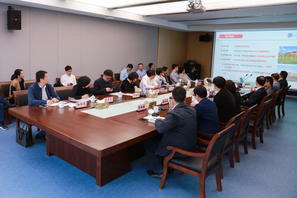 任文霞首先对高浩孟一行来访表示欢迎,对奉化区委区政府一直以来对学校的关心和支持表示感谢。随后,她介绍了学校的基本概况,以及学校近年来在深化产教融合、校企合作,搭建协同创新平台、构建“药德、药规、药技”相融合的人才培养模式、提升社会服务能力等方面的所取得的成绩。任文霞指出,近年来,学校始终秉承时任浙江省委书记习近平在给学校建校二十周年贺信中提出的“抢抓机遇、加快发展,办出水平、办出特色”的十六字精神,坚持“融入产业、服务行业”的办学理念,不断凝练办学特色,积极探索人才培养新模式。此次搬迁至奉化校区后,学校办学条件得到了进一步改善,办学空间得到了进一步拓展,未来,学校将继续朝着建设特色鲜明的一流医药类应用型高等院校的目标而努力前进。