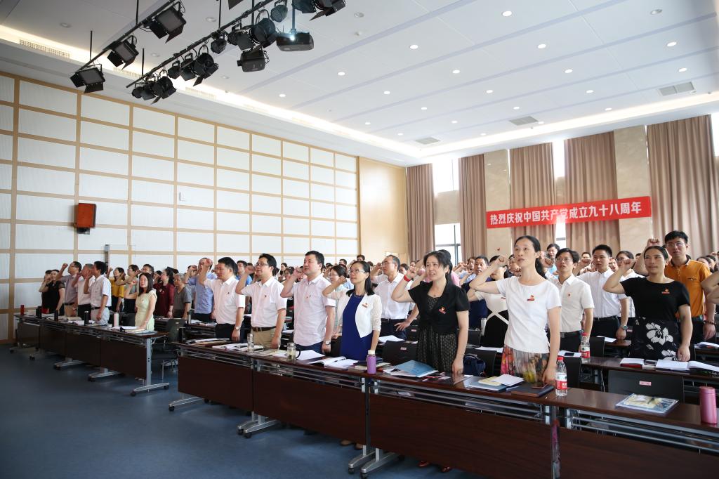 陈厥祥作了题为《大力弘扬红船精神 奋力谱写强校新篇》的讲话。他表示,今天适逢中国共产党创建98周年,让我们共同祝福党的华诞,大力弘扬红船精神,按照干在实处永无止境、走在前列要谋新篇、勇立潮头方显担当的新要求,高度自觉地朝着以习近平同志为核心的党中央擘画的“两个一百年”奋斗目标奋勇前进,奋力谱写强校新篇。他从三个方面就什么是红船精神、如何弘扬红船精神以及怎样借助红船精神建设特色强校作进一步阐释:一是学习红船精神、牢记初心使命。开天辟地、敢为人先的首创精神是红船精神之魂,坚定理想、百折不挠的奋斗精神是红船精神之柱,立党为公、忠诚为民的奉献精神是红船精神之本。我们要从中国共产党的“精神谱系”中来认识红船精神的历史地位和重大价值,努力汲取,并将其转化成为强大的物质力量,武装思想、指导实践、推动工作,铭记入党誓词,坚定践行初心使命。二是传承红船精神、追求强校目标。学精神贵在见行动。正在开展的“不忘初心、牢记使命”主题教育活动提出,要努力做到学思用贯通、知信行统一,我们学习红船精神,目的在于传承和弘扬红船精神。传承红船精神,就应该以红船精神为动力,沿着红船开辟出的红色航道,凝聚人心,劈波前行,作为已列入十三五浙江本科院校建设规划的一所高校,无论升本进程如何,都应该自强不息、奋发图强,追求强校目标——务本、强校、创一流。三是弘扬红船精神、建设特色强校。弘扬红船精神,就要坚定不移沿着“八八战略”指引的路子走下去,要与全面学习内化习近平总书记在浙工作期间提出的一系列重要思想相结合,与贯彻落实习近平总书记给beat36520周年贺信的要求相结合,与贯彻落实好校第二次党代会目标相结合,与高质量完成十三五规划和前瞻性制定好十四五规划相结合,与建设一支高素质专业化人才队伍相结合,与完善推广“三药”高水平人才培养体系相结合,与传承弘扬优秀医药文化相结合,与全面推进党的建设伟大工程相结合。