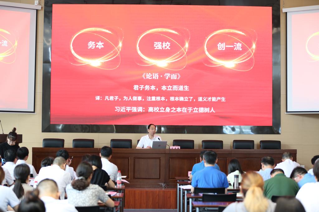 陈厥祥指出,学精神贵在见行动。正在开展的“不忘初心、牢记使命”主题教育活动提出,要努力做到学思用贯通、知信行统一,我们学习红船精神,目的在于传承和弘扬红船精神。传承红船精神,就应该以红船精神为动力,沿着红船开辟出的红色航道,凝聚人心,劈波前行,作为已列入十三五浙江本科院校建设规划的一所高校,无论升本进程如何,都应该自强不息、奋发图强,追求强校目标——务本、强校、创一流。《论语•学而》有云:“君子务本,本立而道生。”其含义为:凡君子,为人做事,注重根本,根本确立了,道义才能产生。借用这句话,能够充分表达我们学校求本、升本、务本的多重价值追求。随着扩校一期任务的圆满完成,扩校、升本、创一流的奋斗目标已经进入到一个新阶段,这个新阶段就是由扩校转变成了强校。新时代在同时面临机遇和挑战的大背景下,实现强校是回答时代命题的需要,是学校建设发展的必然,也是高等学校激烈竞争态势下的立校之本,实现强校首先在强自信,核心在强学院,基础在强管理,关键在强特色,要义在强人才,根本在强落实。