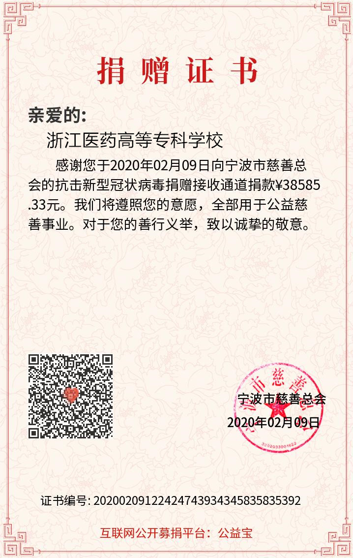 截止2月9日,共有514名会员参与了本次捐款,捐款总额共计38585.33元。beat365全部款项已上缴至宁波市慈善总会并获得捐赠证书。款项具体使用由宁波市新型冠状病毒感染的肺炎疫情防控工作领导小组办公室统一调配。