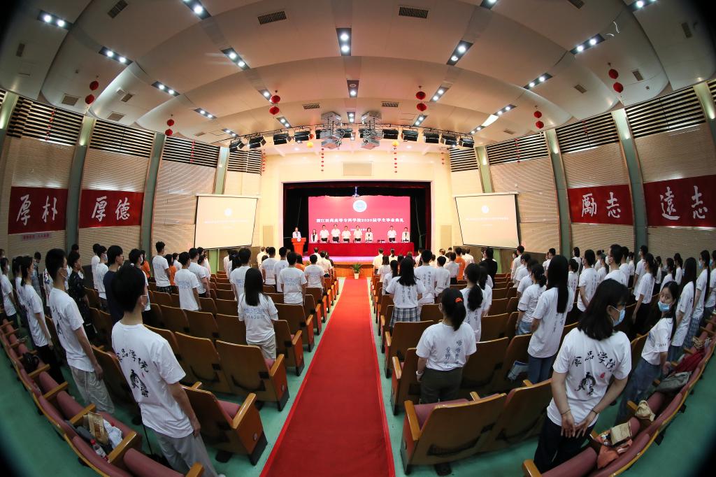 典礼在雄壮的国歌声中拉开帷幕。2020年初的新冠肺炎疫情席卷全国,在这场严峻斗争中,一批医务人员、干部职工、社区工作者因公殉职,许多患者不幸罹难。为此,今年的毕业典礼在奏唱国歌后安排了特殊环节——为在抗击新冠肺炎疫情中牺牲的烈士和逝世的同胞默哀一分钟,以表达敬佩及哀悼之情。