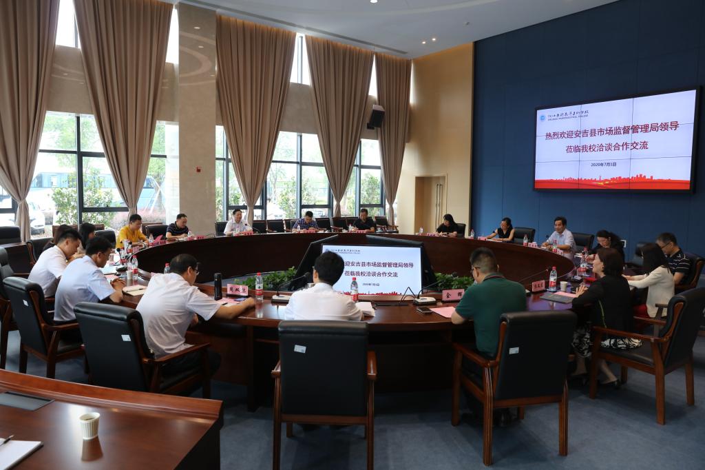 7月1日,安吉县市场监督管理局党委书记、局长王有富率县市场监管局总工程师及食药检测中心、健康产业发展办、药械科等单位部门负责人来beat365奉化校区交流洽谈校地合作。校长任文霞、工会主席金辉、党委委员、办公室主任张佳佳热情接待了王有富一行,科研处(科技产业与社会服务处)、人事处及各学院负责人参加交流座谈会。