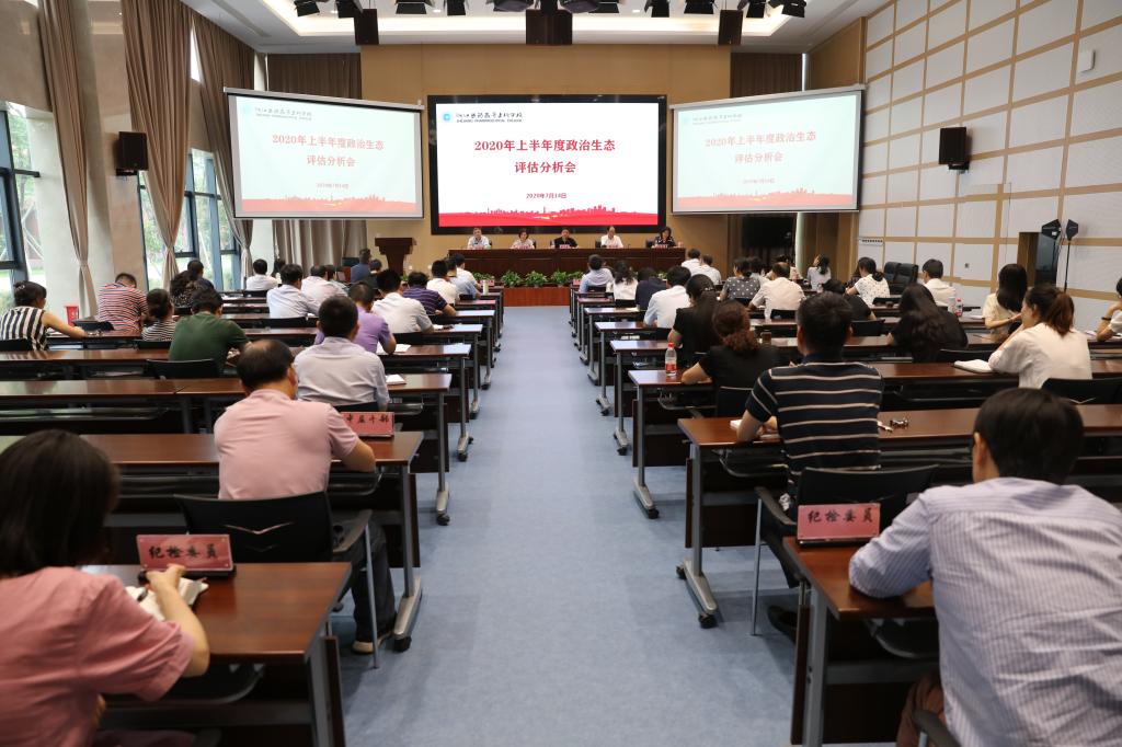 7月14日下午,学校在奉化校区行政楼111会议室召开了2020年上半年政治生态评估分析会。省纪委省监委驻省市场监督管理局纪检监察组副组长陈启见同志到会指导,校党委书记陈厥祥,校党委副书记、校长任文霞,党委委员、副校长杨俊杰,校党委副书记许莉勇,党委委员、副校长韩忠培,党委委员、校纪委书记方子祥,工会主席金辉,党委委员、组织部长陆晓莉,党委委员、宣传部长张佳佳,全体中层干部、各党总支纪检委员等参加了会议。会议由任文霞主持。