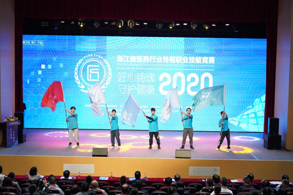随后,裁判员代表卢超和参赛选手代表阮灵娜分别上台进行宣誓。47支参赛代表队队旗依次在台上展示。在开幕式现场热烈的掌声中,徐润龙、邵元昌、陆佩军、盛乐、鲍冬芳、陈厥祥一起上台共同按下启动屏,宣告2020年浙江省医药行业特有职业技能竞赛正式开赛。
