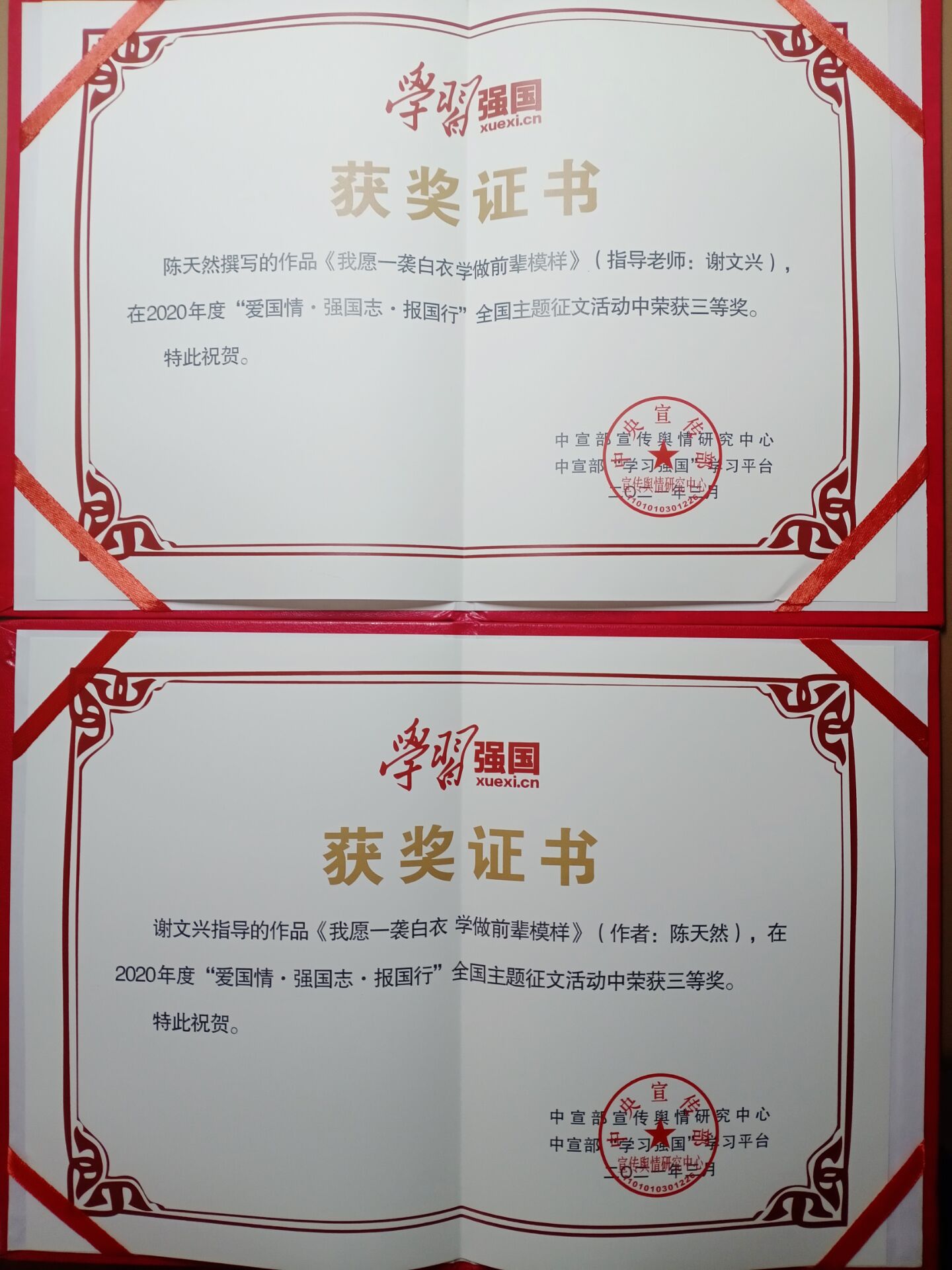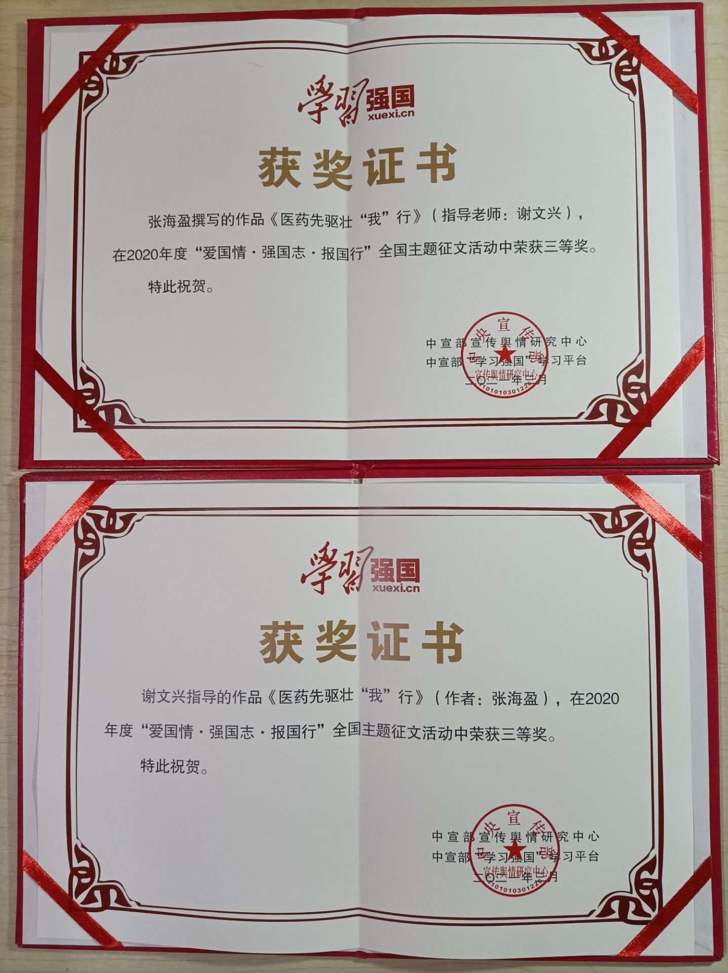 近日,beat365药学院D19药检4班张海盈,Z20药检1班陈天然两位同学获得由中宣部宣传舆情研究中心、中宣部“学习强国”学习平台举办的2020年度“爱国情·强国志·报国行”全国三等奖,两位同学获奖征文由基础学院谢文兴老师指导修改、打磨、投稿。