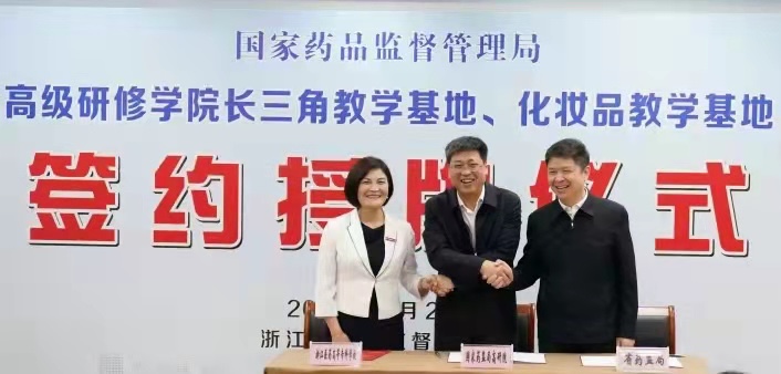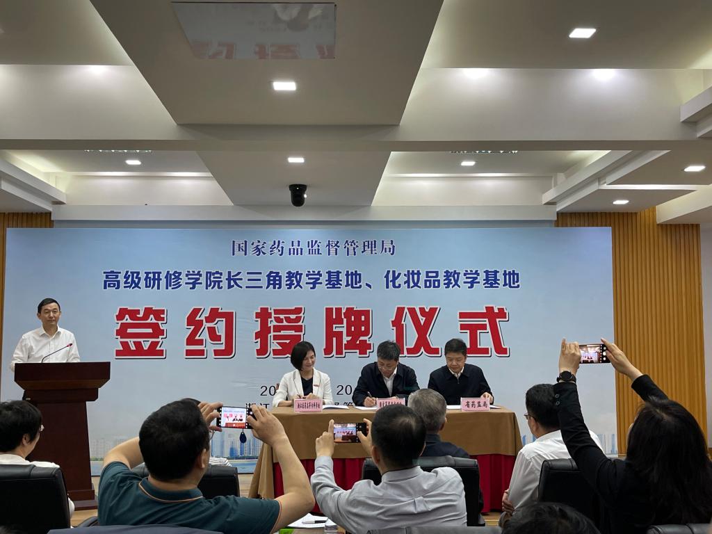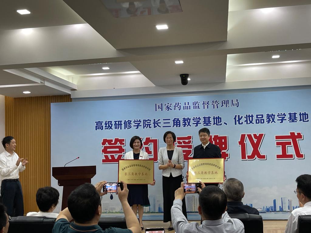 会上,校长任文霞与国家药监局高研院院长李福荣、省药监局局长徐润龙签订了共建“国家药品监督管理局高级研修学院长三角教学基地”合作协议。国家药监局副局长颜江瑛为徐润龙和任文霞授牌。