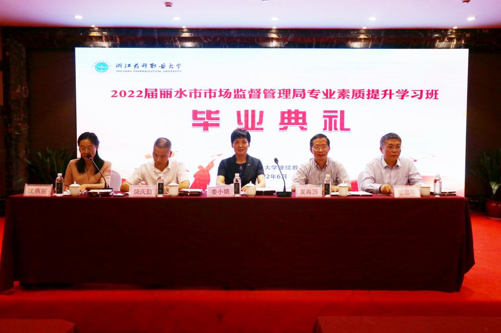 2022年6月23日下午,2022届丽水市市场监管系统干部专业素质提升工程班毕业典礼隆重举行,校党委副书记、校长娄小娥,丽水市市场监管局副局长饶庆勤出席并讲话,校党委委员、副校长沈忠华宣读毕业生名单,原丽水市市场监管局党组书记、局长、现丽水市市场监管局一级调研员夏海国及80名学员、医疗器械学院上课教师、继续教育学院全体教师参加了毕业典礼。毕业典礼由继续教育学院院长沈燕丽主持。