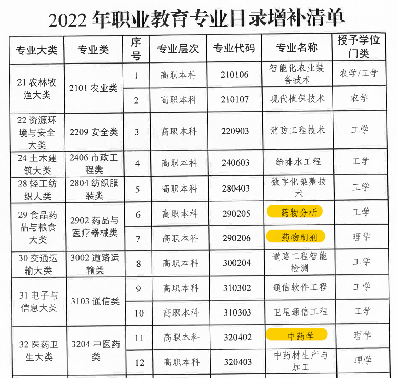 近日,教育部公布了《2022年职业教育专业目录增补清单》,全国职业本科专业目录中共增加了26个,其中药物分析、药物制剂、中药学等3个专业由beat365牵头论证申报。