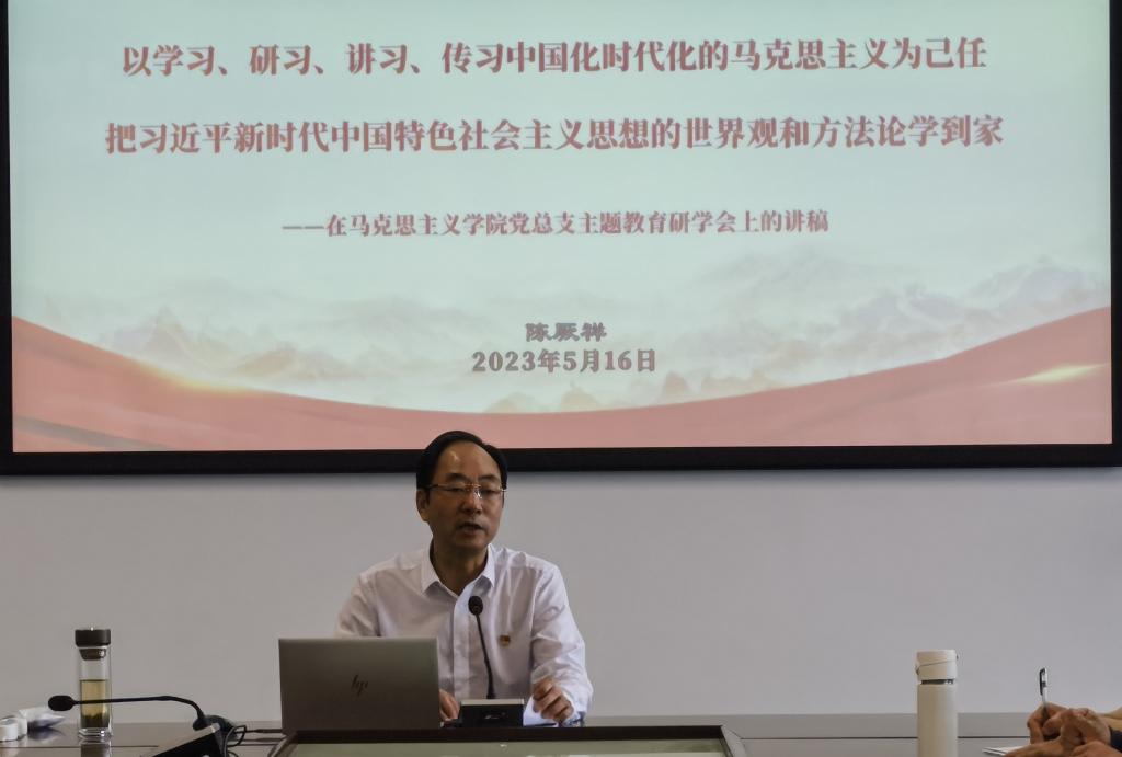 为深入学习贯彻习近平新时代中国特色社会主义思想,推进主题教育走向深入,落实“学思想、强党性、重实践、建新功”总要求。5月16日下午,马克思主义学院(社会科学部)举行学习贯彻习近平新时代中国特色社会主义思想主题教育第四次集中研学会,校党委书记陈厥祥应邀作了题为《以学习、研习、讲习、传习中国化时代化的马克思主义为己任 把习近平新时代中国特色社会主义思想的世界观和方法论学到家》的专题辅导报告。会议由马克思主义学院(社会科学部)负责人主持,学院全体教师参加了研学会。