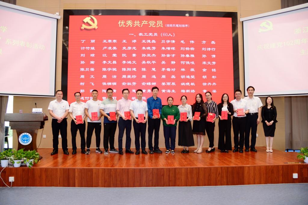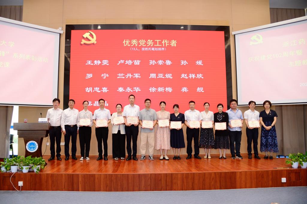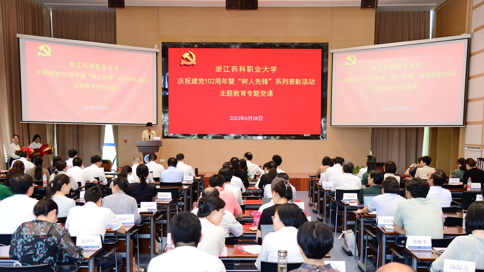 6月28日下午,学校庆祝建党102周年暨“树人先锋”系列表彰活动、主题教育专题党课在奉化校区举行。校党委书记陈厥祥,校长、党委副书记娄小娥,纪委书记徐军伟,党委委员、副校长许莉勇、沈忠华、沈黎新,党委委员韩忠培、张佳佳、楼剑锋、戴桂平等出席大会;省委主题教育第一巡回指导组成员陈皓圆到会指导。学校全体中层干部、各二级党组织副书记、基层党支部书记、“两优一先”代表、新党员代表等参加会议。大会由娄小娥主持。