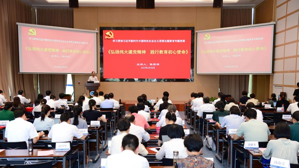 陈厥祥以《弘扬伟大建党精神 践行教育初心使命》为题,为与会人员讲授了一堂精彩生动的主题教育专题党课。他指出,学校党委开展了“学原著读原文悟原理”专题学习活动、“循迹溯源学思想促践行”主题党日活动、党员集体过政治生日活动、党组织书记讲授专题党课活动、党性教育专题影片观看活动、走访慰问活动、“树人先锋”系列评选暨表彰活动等“七个一”党建品牌活动,热烈庆祝中国共产党成立102周年。