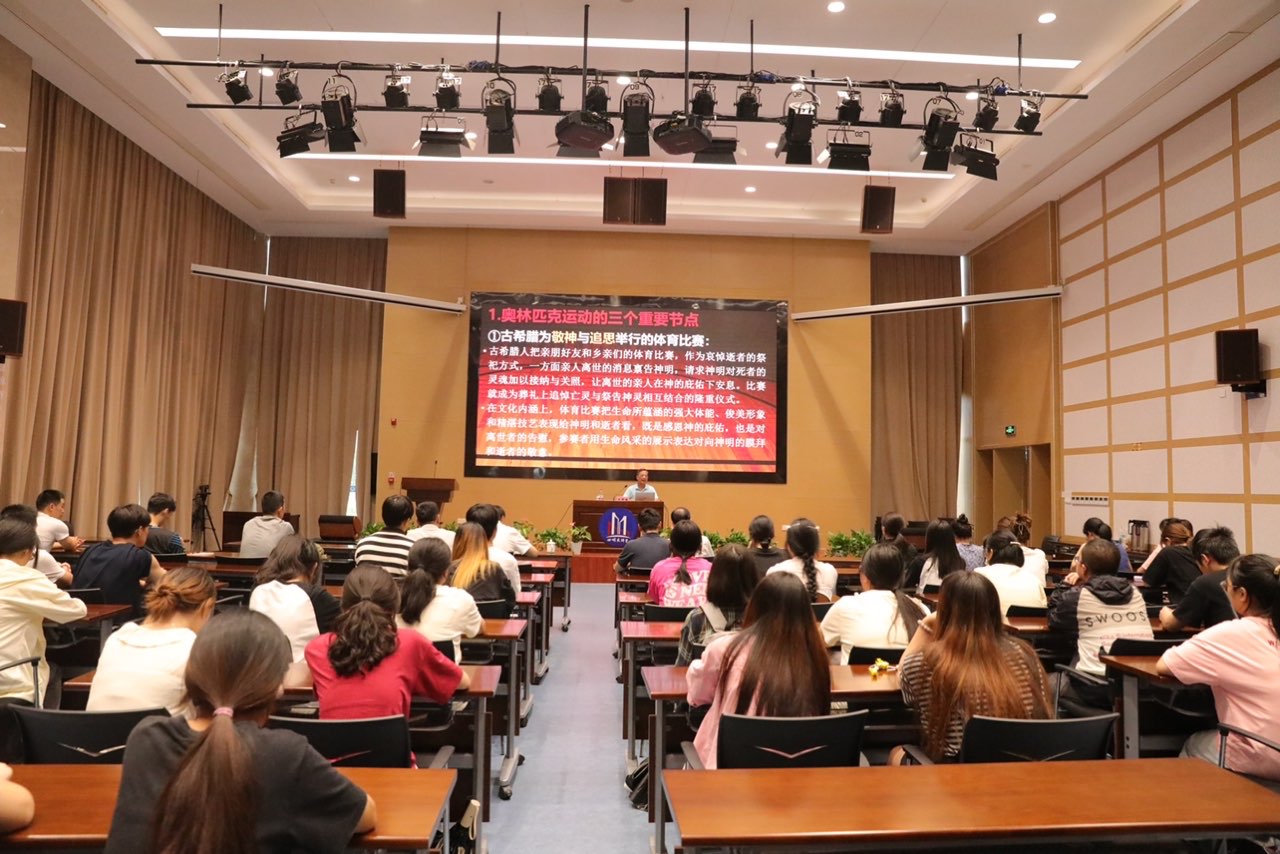 於贤德教授以“朝阳绚丽亚西亚——奥运视域下的杭州亚运会”为切入点,从奥运会的起源、发展及精神内核入手,围绕“奥运会与亚运会,亚运会的发展及其深刻的文化内涵,中国新时代、杭州新亚运”等三个方面,通过丰富详实的案例和图像深刻阐释了奥林匹克运动对人类社会文化演进的重大意义,生动讲述了亚运会的沿革及其文化内涵,指出要学习运动员的勇气和魄力,积极培养自身的拼搏精神,在关键时刻以智力、毅力和魄力为社会和国家贡献青春的力量。最后以“潮平两岸阔,风正一帆悬”为结语表达了对体育精神和体育文化的理解。