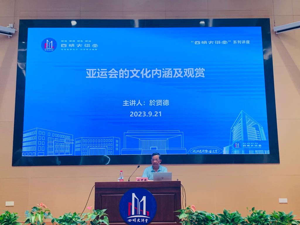 於贤德教授深入解读了新时代的杭州亚运会的举办优势,对比广州亚运会的经验启示,从杭州的历史文化底蕴、杭州亚运会文创特点等角度深入浅出地分析阐释“亚运文化”,并以体育精神和体育之美为视角谈竞技体育比赛的观赏与启迪。