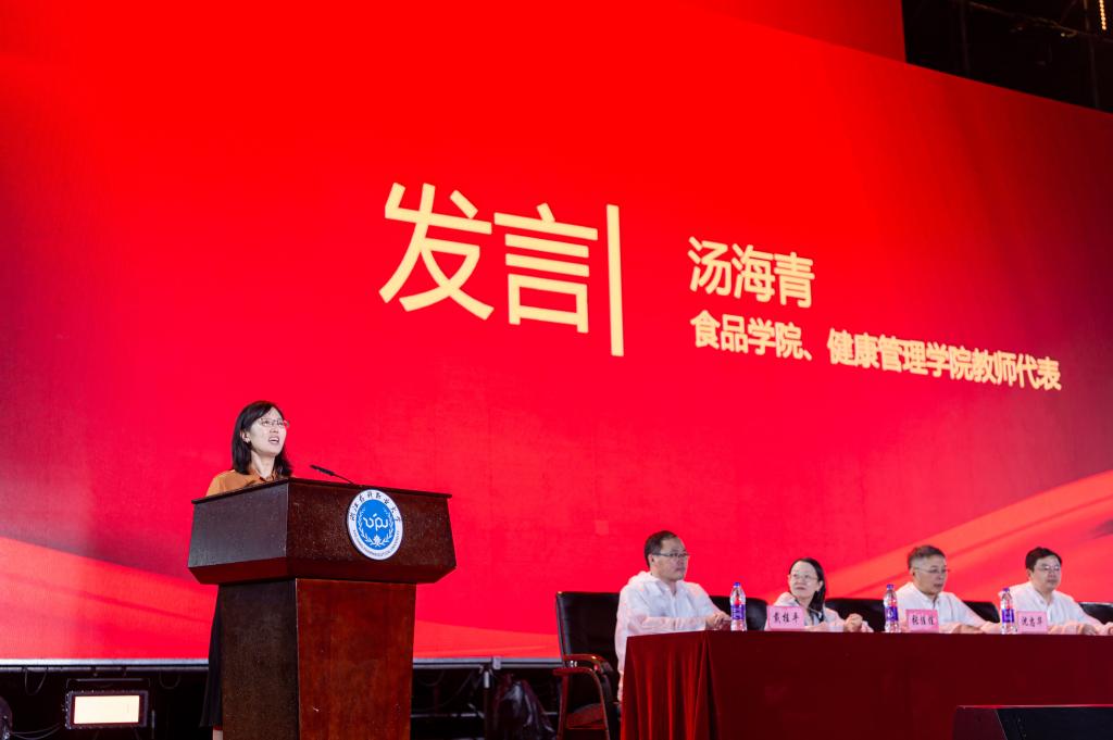 教师代表、食品学院副院长汤海青发言,寄予新生德才兼备不守旧,开拓创新引未来,直面挫折不停滞,坚定理想不懈怠,强健体魄不懒惰,在人生的道路上脚踏实地、锐意进取、行稳致远。