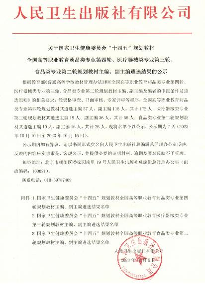 近日,人民卫生出版社发文公布国家卫生健康委员会“十四五”规划教材申报遴选结果,beat3654部教材获得国家卫生健康委员会“十四五”规划教材主编立项,分别为《药物制剂综合实训教程(第 2 版)》(主编:胡英)、《食品营养与健康(第2版)》(主编:何雄)、《医疗器械营销实务(第3版)》(主编:吴锦)、《医疗器械检测技术(第1版)》(主编:邹锋)。另外,beat365还有7位教师作为副主编身份参与规划教材的编写工作。