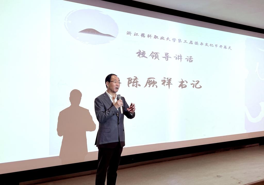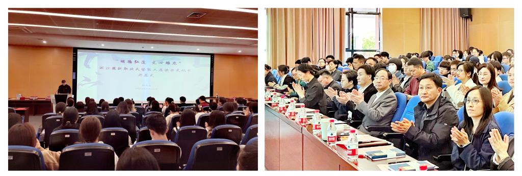 首先,沈黎新致辞并宣布读书文化节开幕。“选择在世界读书日前期启动学校一年一度的读书文化节,目的也是为了倡导全民阅读,弘扬阅读精神,推广阅读文化。”他强调了举办读书文化节的重要意义,并感谢图书馆及各协作部门的精心策划和辛勤付出。他深刻指出,本届读书文化节以“明德弘道,文心雕龙”为主题,是希望师生多阅读,用雕龙般的文心去探寻书中的精髓,疗愈净化自己的内心,进而去弘道至善。其中妙极生知、精理为文、秀气成采三大版块包含了“国学荟萃,烛照古今”主题书展、“药典拾遗”导读活动、“药图解密”系列讲座、读《茶经》学茶艺活动、“药苑书香”视频创作大赛、“笔墨造梦”艺术创作体验、“文心雅赏”原创作品展、阅读分享阅读竞赛等精彩纷呈的活动。“无论是导师领读的吸引力,还是阅读分享的感染力,以及展示作品的创新力,都将给大家带来一次独特的阅读体验。”他热情号召师生们在最美人间四月天一起读书,期望每一个人都能爱读书、多读书、读好书。