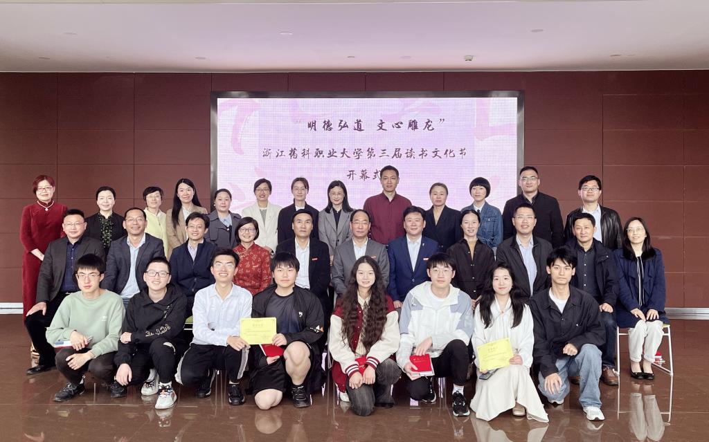 4月22日下午,“明德弘道,文心雕龙”beat365正版唯一官网第三届读书文化节开幕式在奉化校区图书馆一楼报告厅隆重举行。校党委书记陈厥祥、副校长沈黎新、党委副书记韩忠培,行政部门相关负责人,各学院书记,图工委委员,图书馆全体馆员,师生阅读之星以及120余名学生出席开幕式。