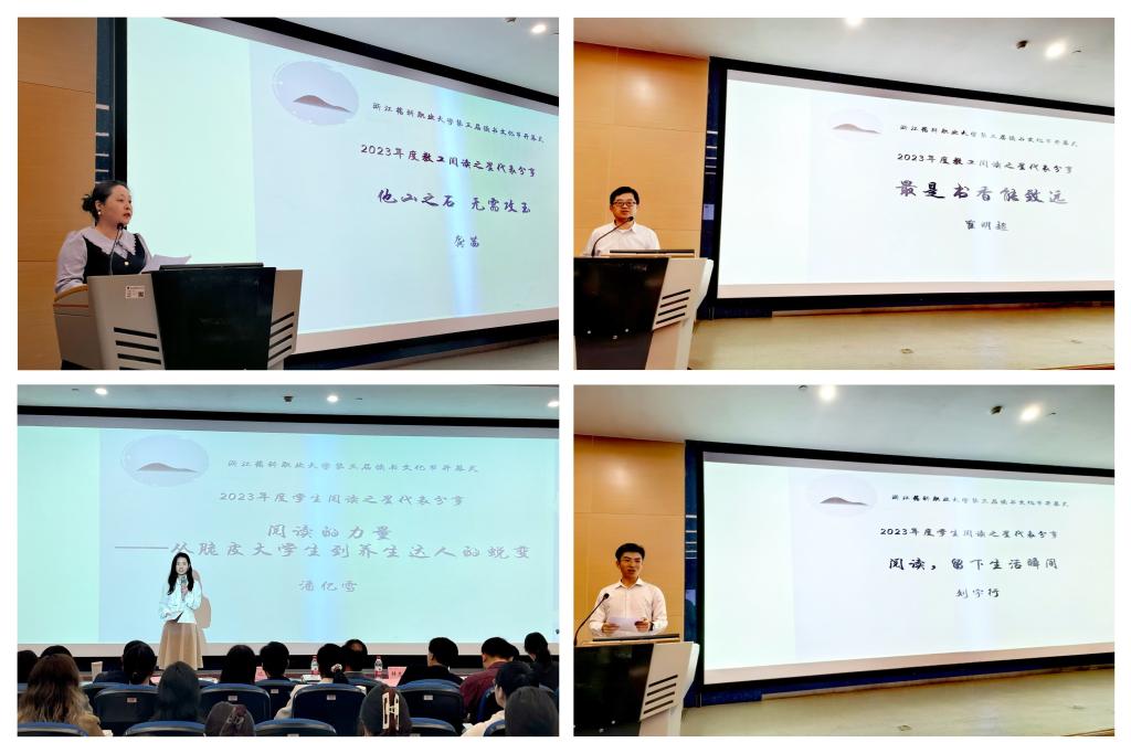 开幕式上,图书馆馆长何俊峻宣布了2023年度师生阅读之星获奖名单,校领导为获奖师生代表颁发了证书。作为阅读之星教工代表,体训部教师龚茜和中药学院教师崔明超分别发表了《他山之石无需攻玉》和《最是书香能致远》的阅读感言。中药学院学生潘亿雪和医疗器械学院学生刘宇航作为阅读之星学生代表分享了《阅读的力量:从脆皮大学生到养生达人的蜕变》和《阅读,留下生活瞬间》的阅读心得。