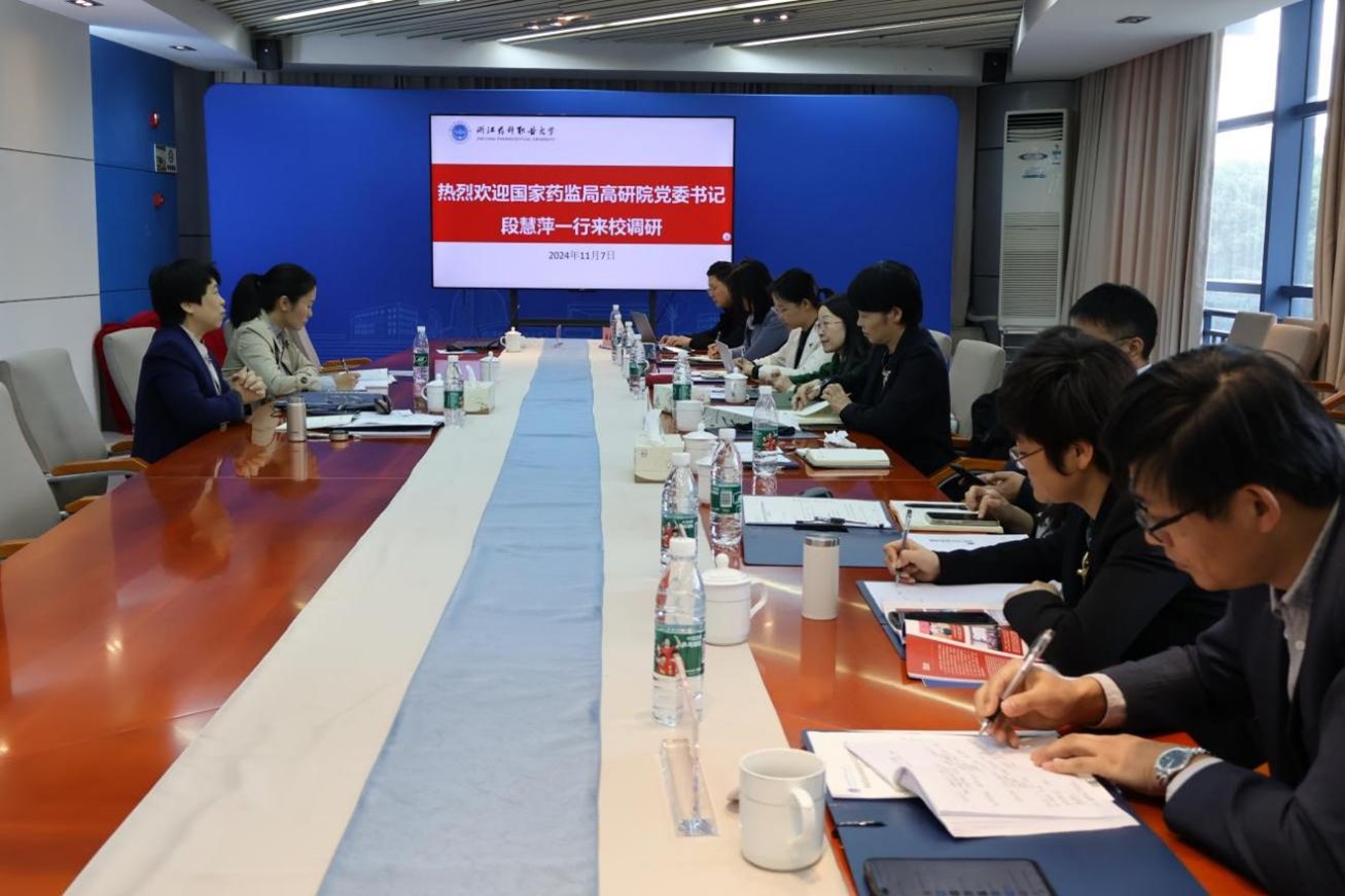 11月7日上午,国家药品监督管理局高级研修学院党委书记、院长、药品行指委主任委员段慧萍,教材部副主任、药品行指委副秘书长李晶一行来校调研指导。校长娄小娥、副校长沈忠华,药品行指委教科研专委会和药品食品质量管理类专委会秘书处、继续教育学院以及浙江京新药业相关人员等参加调研座谈会。