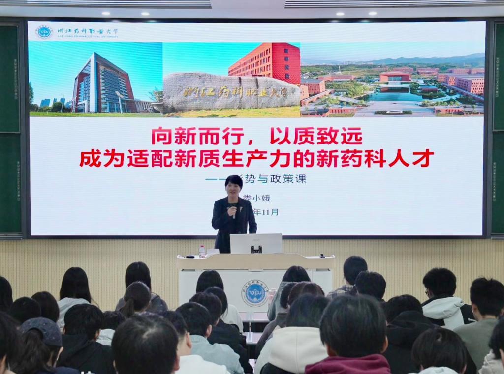 为深入学习贯彻党的二十届三中全会精神,进一步系统阐释习近平总书记关于发展新质生产力的重要论述,帮助学生全面而准确地理解新质生产力深刻内涵、基本特征和发展要求,成长为符合新质生产力发展需求的“新药科”人才,11月7日,校长娄小娥在鄞州校区2阶2教室为制药工程、制药设备、企业数字化管理专业的240余名学生讲授形势与政策课。
