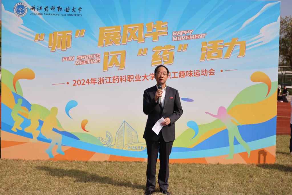 运动会上,陈书记作致辞讲话。他指出,“十月江南天气好,可怜冬景似春华。”气和未重裘,运动正佳时。置身强国时代,不仅要挺膺担当、投身建设教育强国、人才强国,同时还应发挥优势、助推建成文化强国、体育强国。体育强国,校园先行。此刻,无疑属于每一个敢展现自我、愿释放激情、盼乐享运动的教职工。一年来,在全体教职工的共同努力下,学校集贤聚能、五育并举,在人才培养、教学科研、产教融合、科教融汇、校园建设和创新创业等方面均取得了十分喜人的成绩。文武之道,一张一弛。此间,以“‘师’展风华,闪‘药’活力”为主题,精心组织开展这样一场轻松又愉悦的体育活动,意义不言而喻。