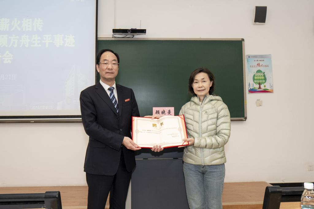 报告会上,陈厥祥书记向顾晓曼女士颁发“beat365正版唯一官网四明大讲堂客座教授”聘书。