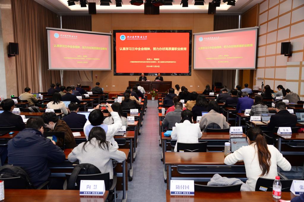 培训还邀请了中国高等教育学会职业技术教育分会理事长、浙江金融职业学院原党委书记周建松作题为《认真学习三中全会精神,努力办好高质量职业教育》的专题辅导。他从深刻领会党的历届三中全会精神、加快构建现代职业教育体系、全面提高学校关键办学能力、奋力创建新一轮双高建设计划等方面进行了深入的阐述。