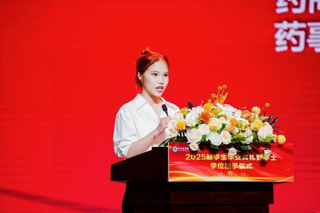 毕业生代表、药事服务与管理专业的王欣轲同学代表全体毕业生发言。她动情地说:“我们从青涩走向成熟,从迷茫走向坚定,是母校用厚药德与强药技,为我们撑起了成长的屋檐。”她回顾在beat365正版唯一官网的求学时光,从实验室的日日夜夜,到志愿服务的温暖瞬间,每一段经历都让她更加坚定地走上“为健康赋能”的人生之路。她特别感谢老师的陪伴与家人的支持:“毕业不是结束,而是带着所有人的目光与祝福,去成为更好的自己。”她的一句“爸妈,我毕业了”,引起全场强烈共鸣。