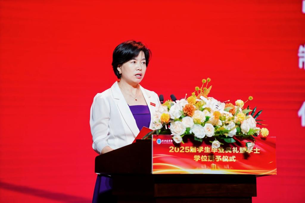 整场典礼最动人心弦的时刻,来自校长娄小娥的深情致辞。她以《以专业之心,行温暖之路,赴幸福之约》为题,倾情讲授“毕业前的最后一课”。她在讲话中特别指出,今年学校共有4253名毕业生圆满完成学业,其中包括2827名三年制专科毕业生与1426名本科毕业生。