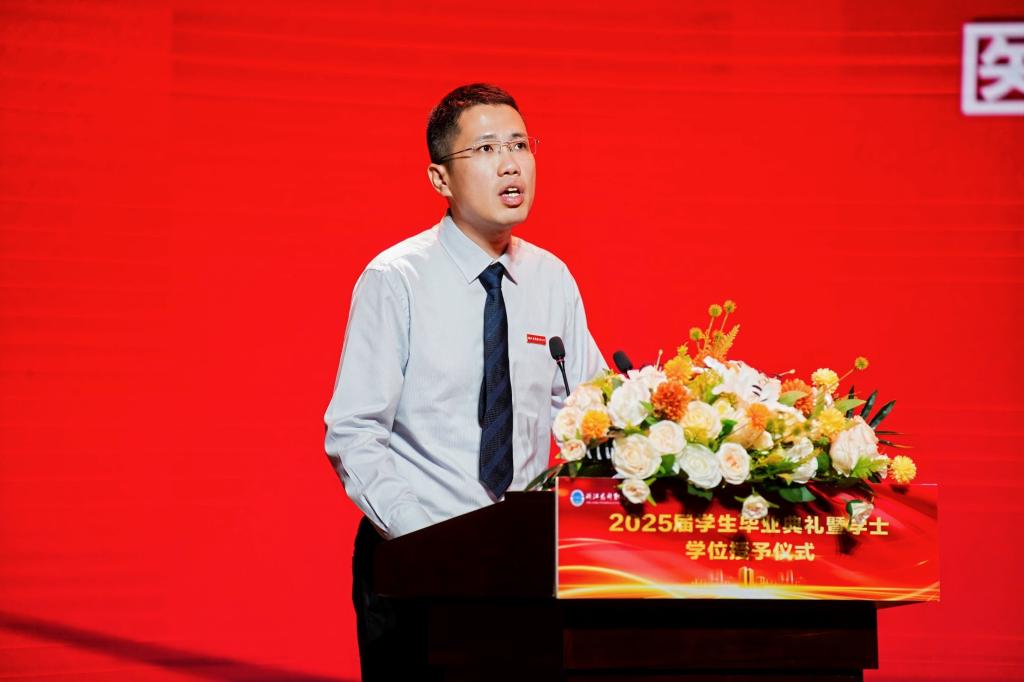 教师代表、医疗器械学院党委副书记赵祥欣在发言中回望了2025届学生的成长历程。他说,这一届学生注定与众不同:“你们经历了疫情带来的不确定,适应了实习制度的改革,也承受着不断加速的社会节奏,但你们没有退缩,始终以韧性与担当回应挑战。”他表示,作为教师,最欣慰的不是看到成绩单上的分数,而是看到学生身上那种“越来越像医药人”的气质:沉静、专注、有温度。