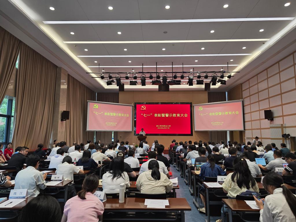 为庆祝中国共产党成立104周年,扎实推进学校深入贯彻中央八项规定精神学习教育,进一步激励全校各级党组织和广大党员干部奋发进取、争先创优,不断增强凝聚力和战斗力,以高质量党建引领事业高质量发展。6月27日下午,学校“七一”表彰暨警示教育大会在奉化校区行政楼召开。校长、党委副书记娄小娥,副校长许莉勇、沈忠华,党委副书记沈黎新、韩忠培,党委委员张佳佳、楼剑锋、戴桂平等出席活动;学校全体中层干部、各二级党组织书记、副书记、基层党支部书记、“两优一先”代表、新党员代表等参加大会,表彰大会由韩忠培主持。