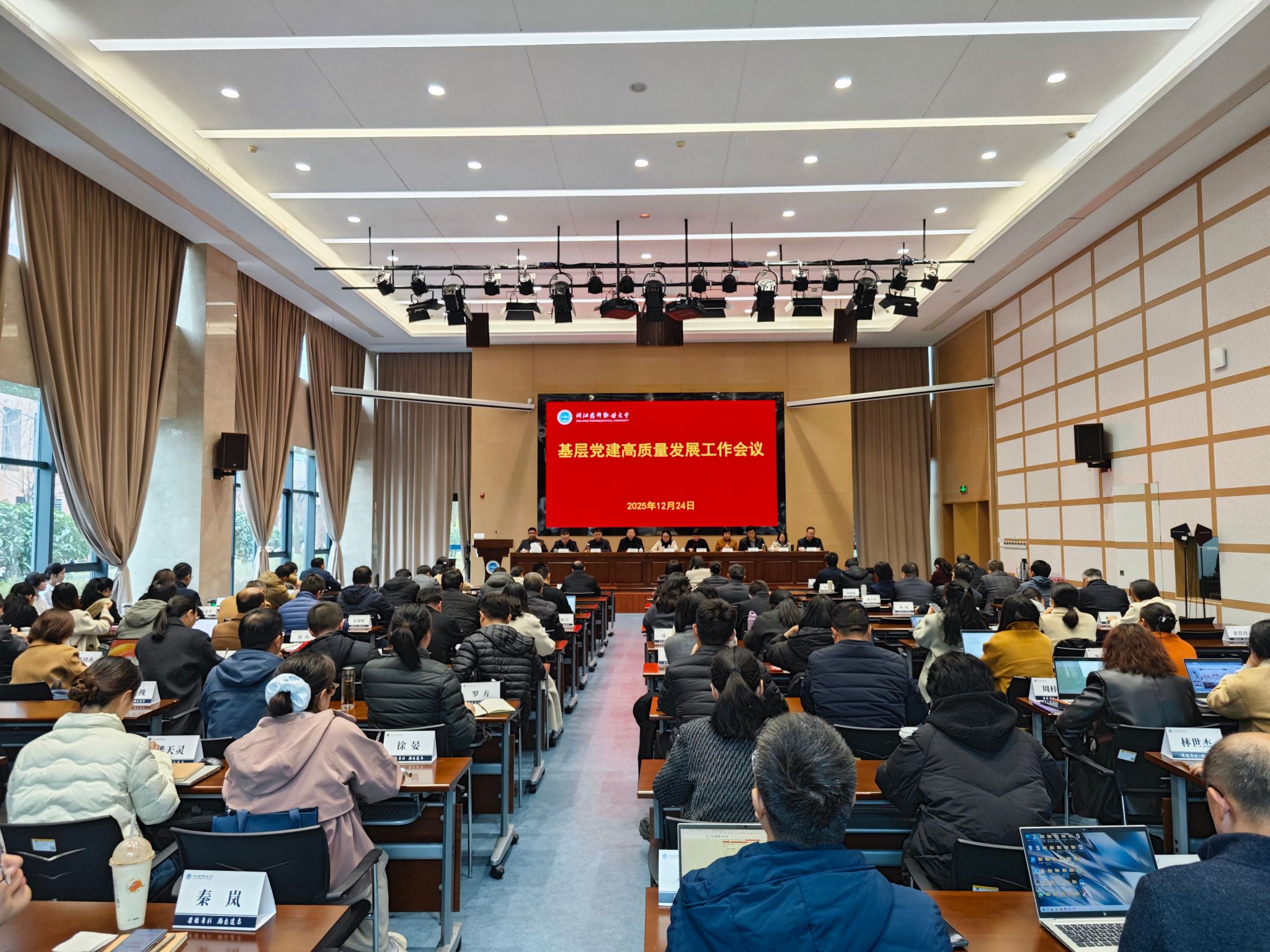 为深入学习贯彻党的二十届四中全会精神,全面贯彻落实省委《关于全面加强高校党的领导 提高高校办学治校水平的意见》文件精神,持续深化省委巡视反馈意见整改落细落实工作,全面加强党对高校工作的领导,持续提升办学治校能力,扎实推进基层党建与学校事业发展深度融合。12月24日下午,学校基层党建高质量发展工作会议在奉化校区行政楼召开,学校领导班子成员、各二级党组织书记、副书记、基层党支部书记、各部门主要负责人、二级学院院长、组织员以及学校第一期中青班学员等参加了会议,会议由校长、党委副书记娄小娥主持。
