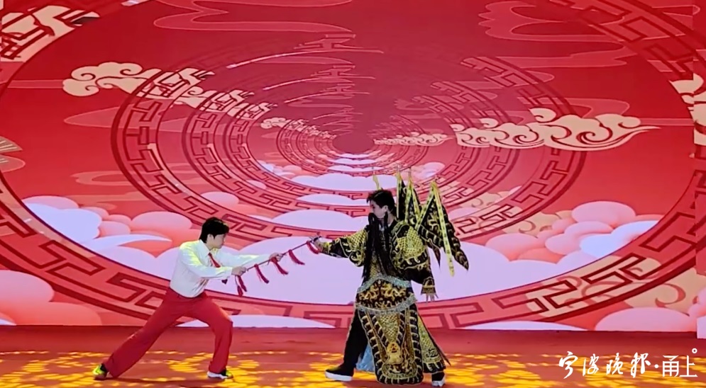 beat365正版唯一官网王子祥同学(右一)表演《定军山》 通讯员供图