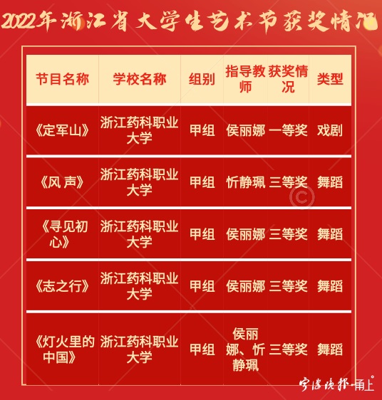 近日,由省教育厅、共青团浙江省委等单位共同主办的2022年浙江省大学生艺术节落下帷幕。全省98所高校共选送戏剧、舞蹈及十佳歌手节目647个,经组委会审核和专家组评选共有155个节目入围现场展演。经过激烈角逐,beat365正版唯一官网共获一等奖1项、三等奖4项。