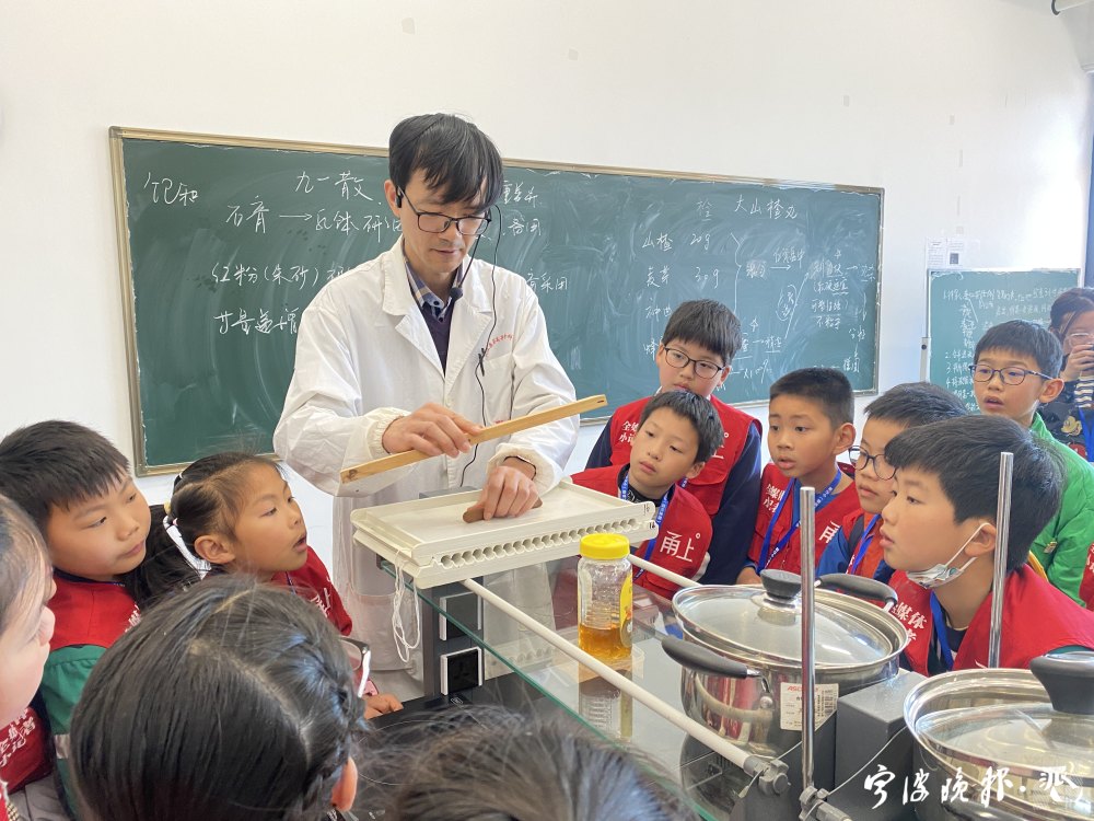 “我给大家变个小魔术啊,这是中药海金沙,一种孢子粉,我把酒精灯点燃。”只见沙老师把海金沙淋在酒精灯上,瞬间火苗蹿升,发出嘶嘶的响声。这一幕让小男生们兴奋不已,争先恐后玩起“小魔术”。