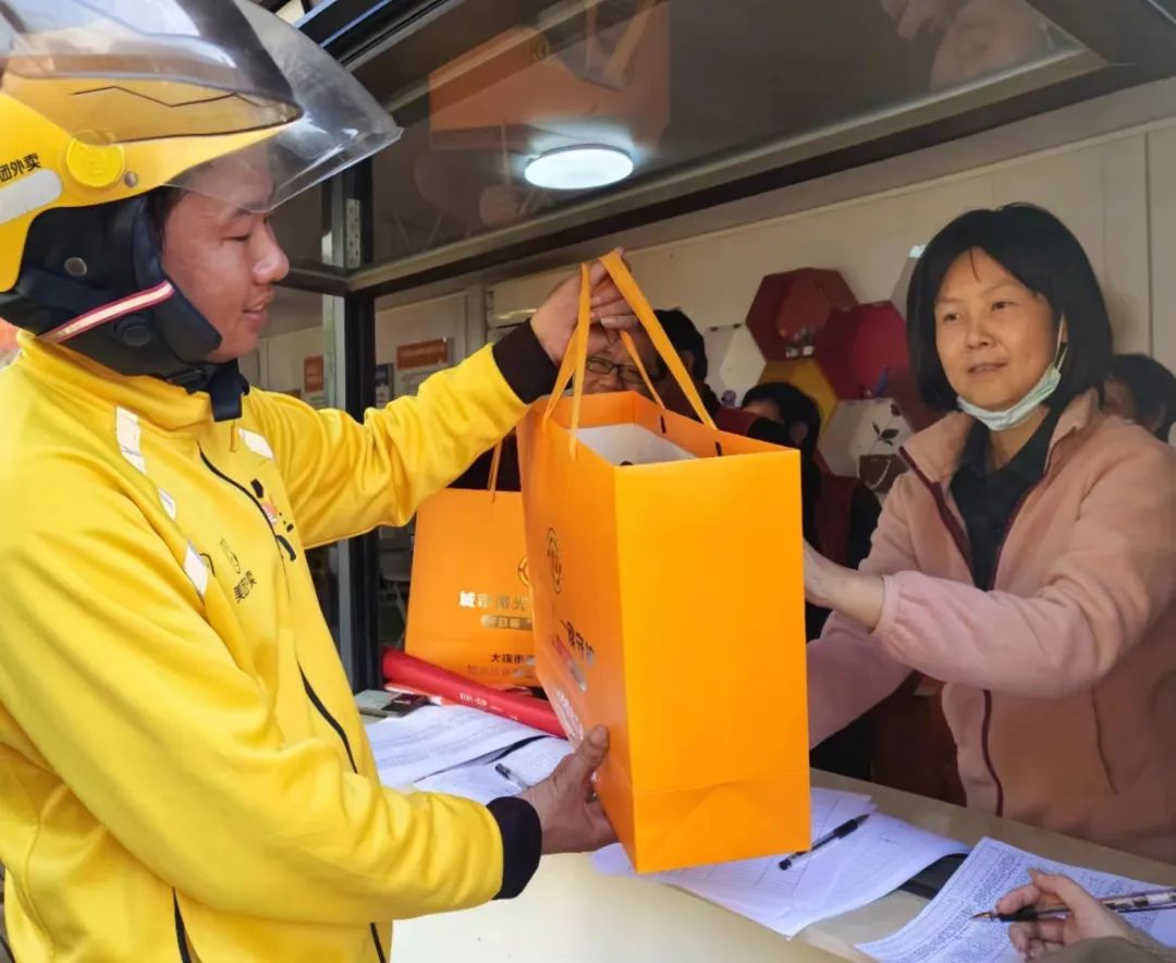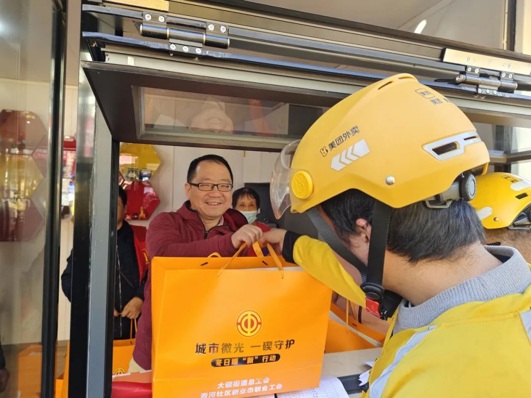 “师傅,这是您的礼包,辛苦啦。”11月29日下午,岩河社区户外劳动者爱心站点内,北仑区三支社的社员们、银龄先锋队、“红管家”服务队的志愿者们陆续将110余份“暖冬套餐”送到了外卖小哥们的手中,感谢他们的辛苦付出,也将暖心祝福送给他们。