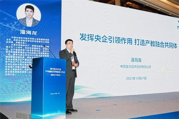 共同体成立大会后进行了医药产教论坛。来自企业、高水平院校、职业院校及行业协会等专家为产教融合共同体建设纷纷出招,为产教融合发展贡献力量。中国生物技术股份有限公司质量管理部主任潘海龙作了题为《发挥央企引领作用打造产教融合共同体》的报告。