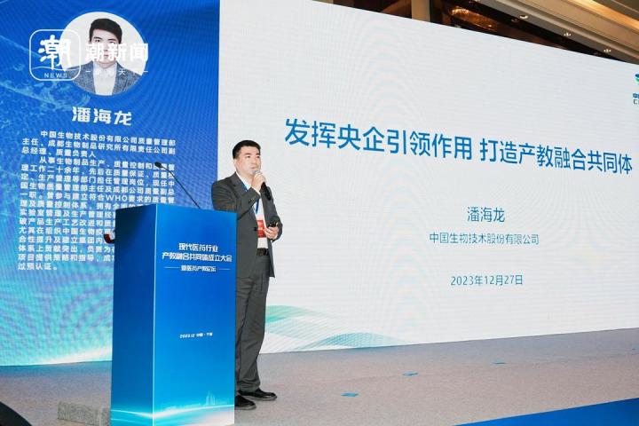 共同体成立大会后进行了医药产教论坛。来自企业、高水平院校、职业院校及行业协会等专家为产教融合共同体建设纷纷出招,为产教融合发展贡献力量。中国生物技术股份有限公司质量管理部主任潘海龙作了题为《发挥央企引领作用打造产教融合共同体》的报告。