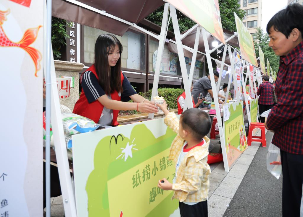“来来来,走过路过不要错过啊!”在童心义卖区,摊位上摆满了各式文具、玩具、手工制品等,几名身着少数民族服饰的“小摊主”们正卖力地吆喝,招揽了众多社区小伙伴前来围观。在游戏募捐区,“纸捞小锦鲤”“漆扇体验”等互动游戏吸引了众多居民前来体验,居民们向社区互助基金捐款即可获得游戏机会,简单又亲民的互动方式让居民们在轻松愉悦的氛围中参与慈善。“以书换蔬”摊位前人头攒动,爱心家庭纷纷将家中闲置的图书捐赠出来,为社区书屋添砖加瓦。这些图书被消毒、整理后,将供社区居民自主借阅,捐赠图书的爱心家庭也获得了游戏套圈的机会,并获取新鲜的助农蔬菜。