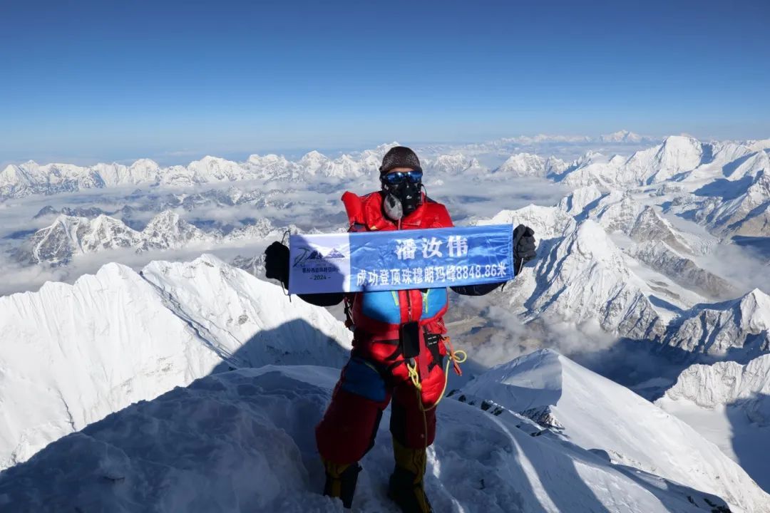 5月22日8时53分,潘汝伟登顶8848.86米的珠穆朗玛峰,当他拉开校训旗帜的那一刻,和他一起站在地球之巅的还有他热爱的母校。